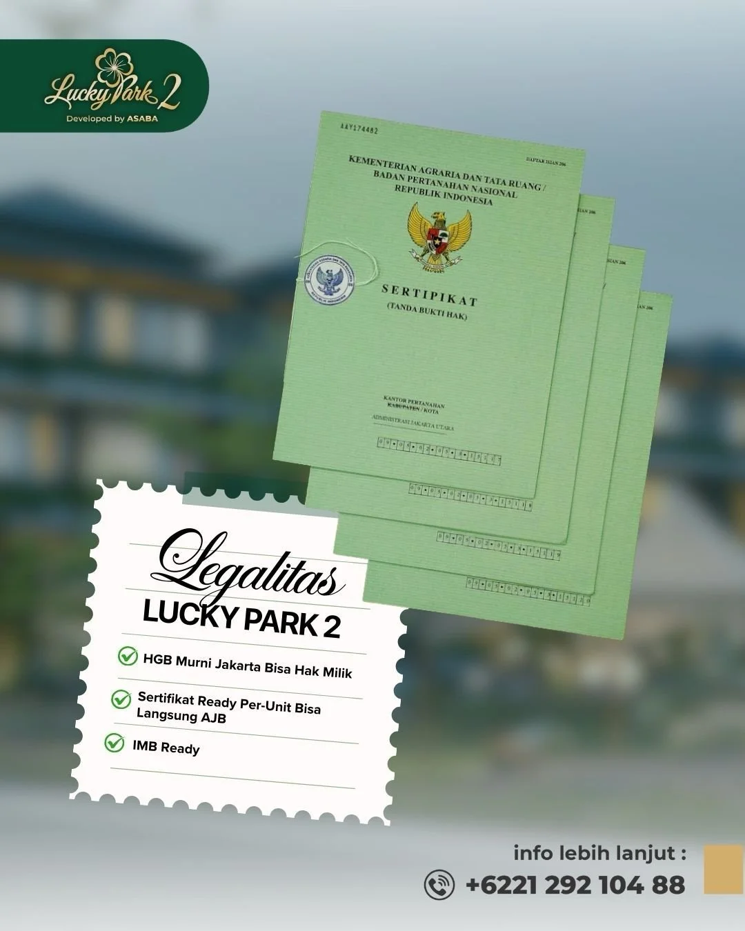 Setiap unit Lucky Park 2 memiliki sertifikat HGB Murni DKI Jakarta yang sudah di-split per unit — kejelasan legalitas yang menjadi pertimbangan utama bagi pembeli rumah mewah PIK.